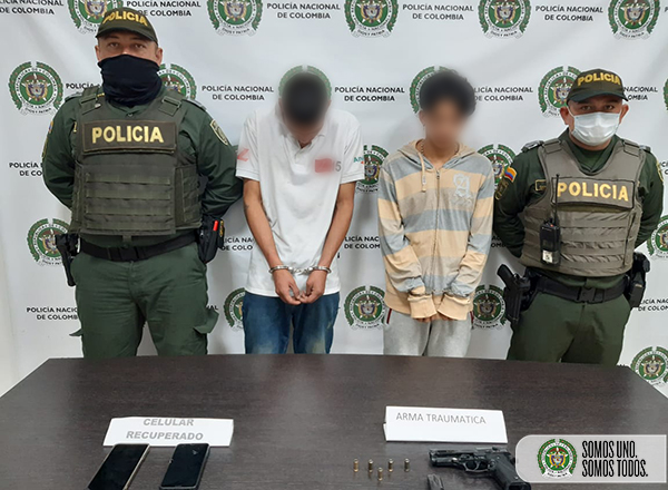 De inmediato se realizó un “plan candado” a través del cual se logró dar captura a dos personas en la entrada del municipio Copacabana. En la requisa les encontraron los dos celulares hurtados y además se les incautó un arma traumática; igualmente un taxi donde huían fue inmovilizado.