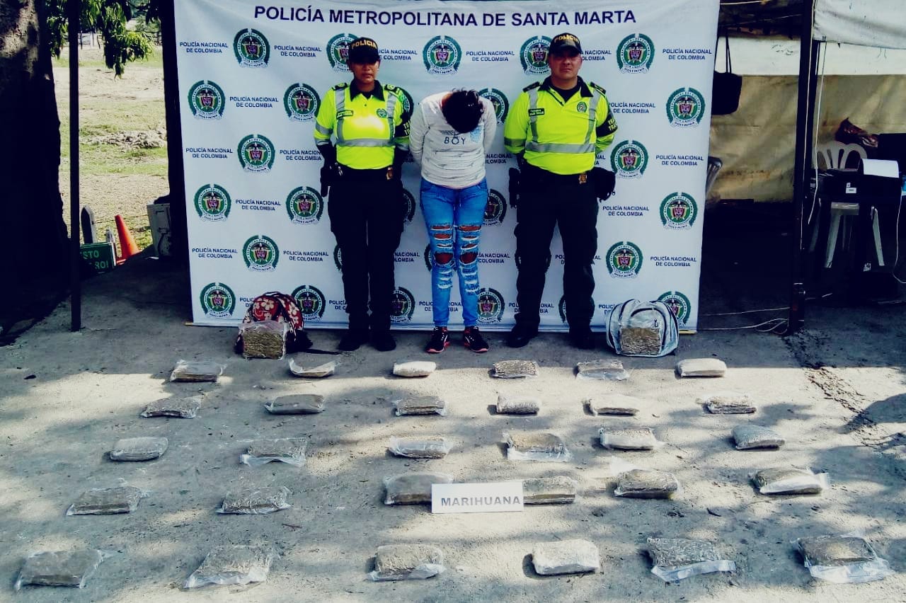 La Policía Nacional, a través de uniformados adscritos a la Seccional de Tránsito y Transporte, de la Metropolitana de Santa Marta, y gracias a los controles que se vienen realizando en los diferentes ejes viales de acceso a la ciudad, logran la captura en flagrancia de una mujer sindicada del delito de tráfico, fabricación y porte de estupefacientes.