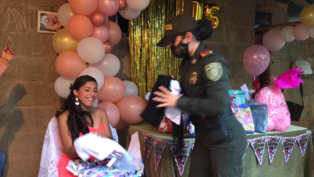 Llevando momentos de felicidad, en medio de la difícil situación por la que atravesamos a causa de la pandemia del COVID-19, resaltando el valor y pujanza de la mujer santandereana. Muy seguramente Linda nunca olvidara esta celebración de quince años, tal vez llegó a pensar que no tendría festejo de 15 años; pero el Departamento de Policía Santander le hizo saber a ella, a su querida madre y a la comunidad, que no estaban solas que la Policía Nacional siempre estará ahí para brindarles protección y alegría cuando menos lo esperan, continuaremos realizando este tipo de actividades, enmarcadas en uno de los pilares de nuestro Director General “Una Policía Para la Gente”. Policía Nacional: ‘Somos uno. Somos todos’.