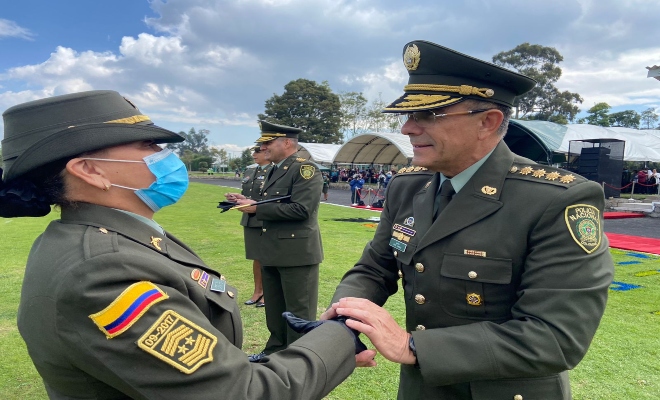 Bogotá D.C. En el campo de paradas de la Escuela de Suboficiales y Nivel Ejecutivo ‘Gonzalo Jiménez de Quesada’, en Sibaté (Cundinamarca), se llevó a cabo este viernes la ceremonia de ascenso de hombres y mujeres policías que escalan un nuevo peldaño en su carrera institucional.