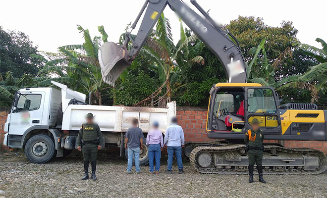 Estas personas capturadas por el delito de explotación ilícita de yacimiento minero y otros materiales, la retroexcavadora y la volqueta incautada avaluadas en 630 millones de pesos, fueron son dejadas a disposición de la Fiscalía de turno URI.
