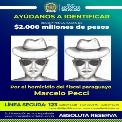 Cartagena. La Policía Nacional revela el retrato hablado de uno de los presuntos autores del homicidio del fiscal especializado contra el Crimen Organizado de Paraguay, Marcelo Pecci, registrado en la mañana del pasado 10 de mayo en la isla de Barú, Cartagena.