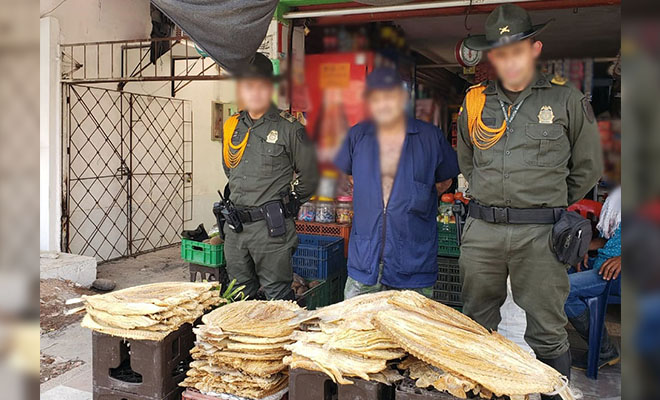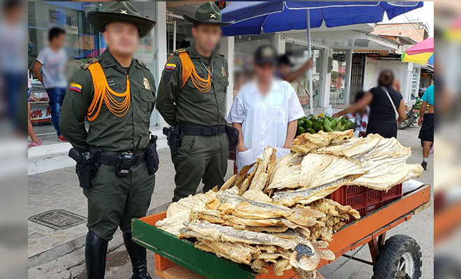 Durante los procedimientos adelantados en el municipio de Fuentedeoro, se realizó la incautación de 177 kilogramos de pescado seco, los cuales eran comercializados por dos mujeres y un hombre de edades 38, 42 y 54 años respectivamente, sin cumplir lo establecido en la Ley 9 de 1979 donde se reglamentan las medidas sanitarias.