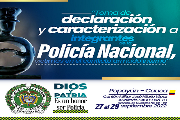 El señor Coronel Alexander Castillo Marín, jefe de la Unidad Policial para la Edificación de la Paz, invita a todos los hombres y mujeres que integran la institución quienes se consideren víctimas del conflicto armado interno, para que participen en la “Jornada Toma de Declaración y Caracterización”, a efectuarse los días 27, 28 y 29 de septiembre 2022, en las Instalaciones del Cantón Militar José Hilario López en la ciudad de Popayán-Cauca.