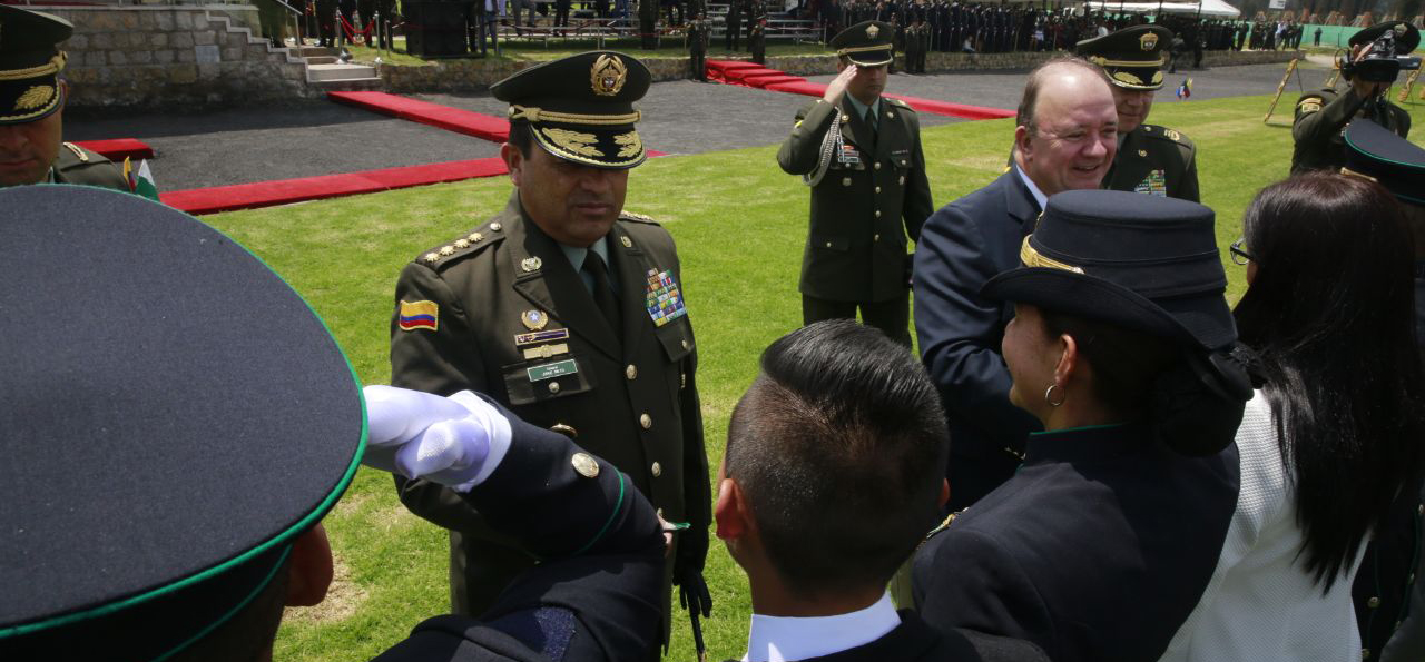 El ministro de defensa, Luis Carlos Villegas Echeverri, y el director general de la Policía Nacional, general Jorge Hernando Nieto Rojas, presiden la ceremonia central en la Escuela ‘Gonzalo Jiménez de Quesada’.