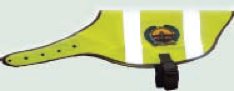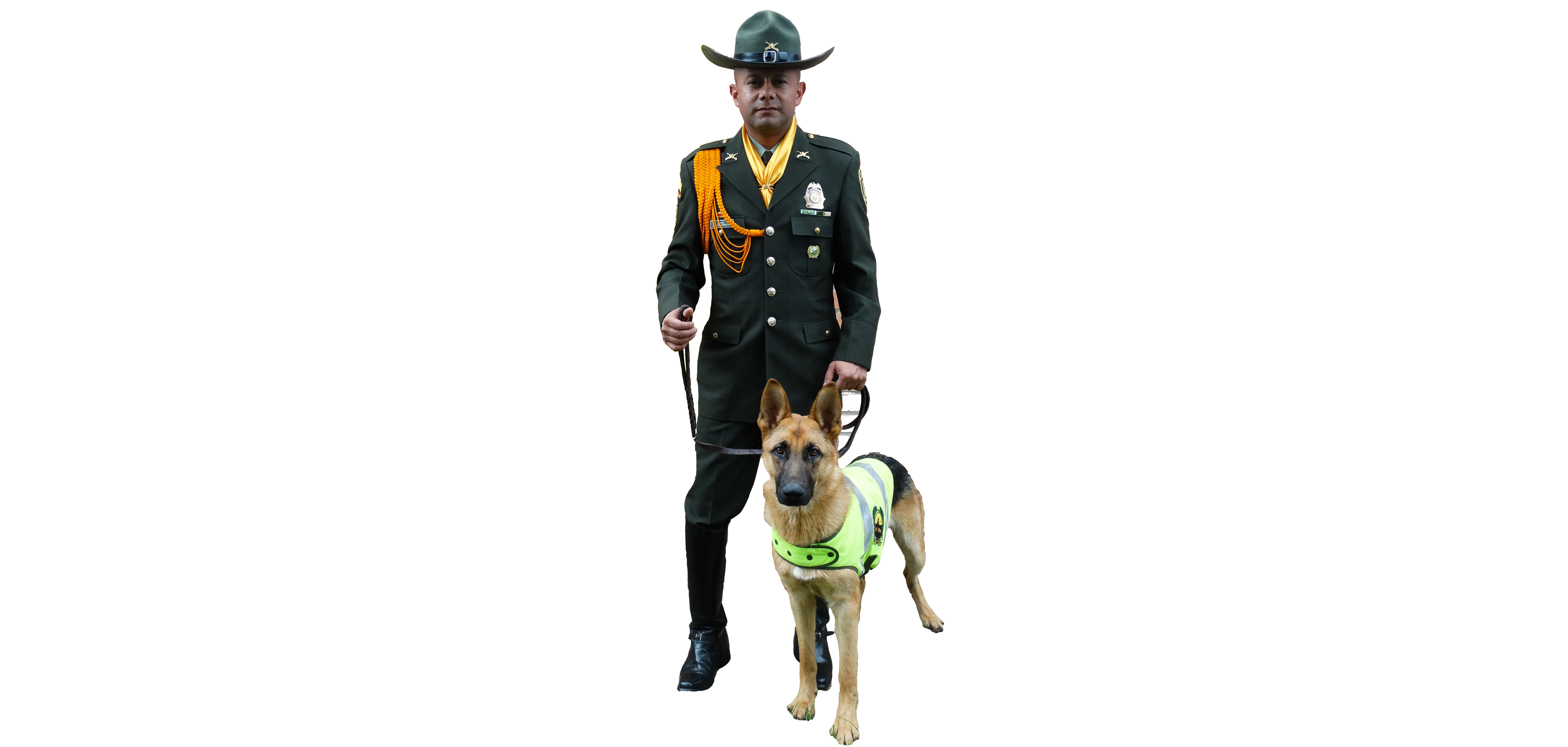 Chaleco: Color limón fluorescente, dos franjas reflectivas, dos bordes negros, escudo de la Policía Nacional y escudo de la especialidad Guía Canino.