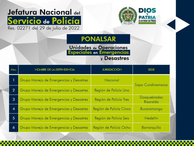 Actualmente, la Unidad Operaciones Especiales en Emergencias y Desastres – PONALSAR, cuenta con las siguientes capacidades técnicas y tecnológicas para el desarrollo de operaciones de salvamento, búsqueda y rescate, destinadas a apoyar las tareas adelantadas por las entidades de manejo de emergencias pertenecientes al Sistema Nacional de Gestión del Riesgo de Desastres (SNGRD), así: