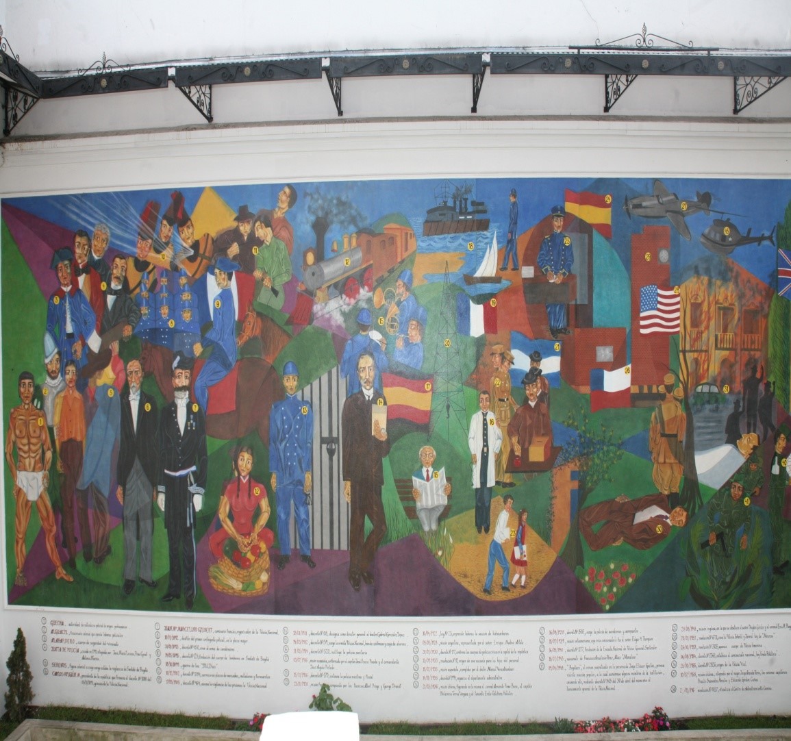 1. En el patio No. 3: Alegóricos murales, enseñan un recorrido por el proceso histórico policial, escenario en el que además se rinde tributo a nuestros hombres y mujeres caídos en actos del servicio a través del Panteón de los Héroes.