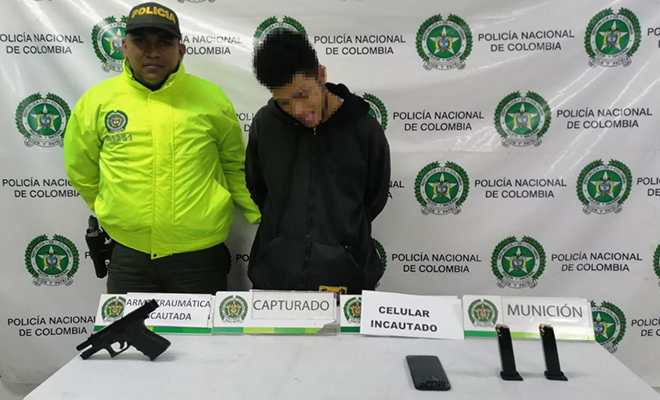 Allí fueron reducidos los delincuentes que se movilizaban en el automotor, lo cual permitió luego de la requisa encontrarles dos armas traumáticas con dos proveedores y 18 cartuchos, además 2 celulares hurtados, avaluados en $2’300.000.