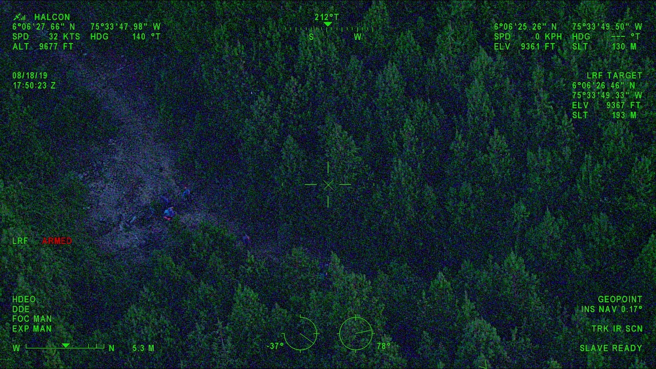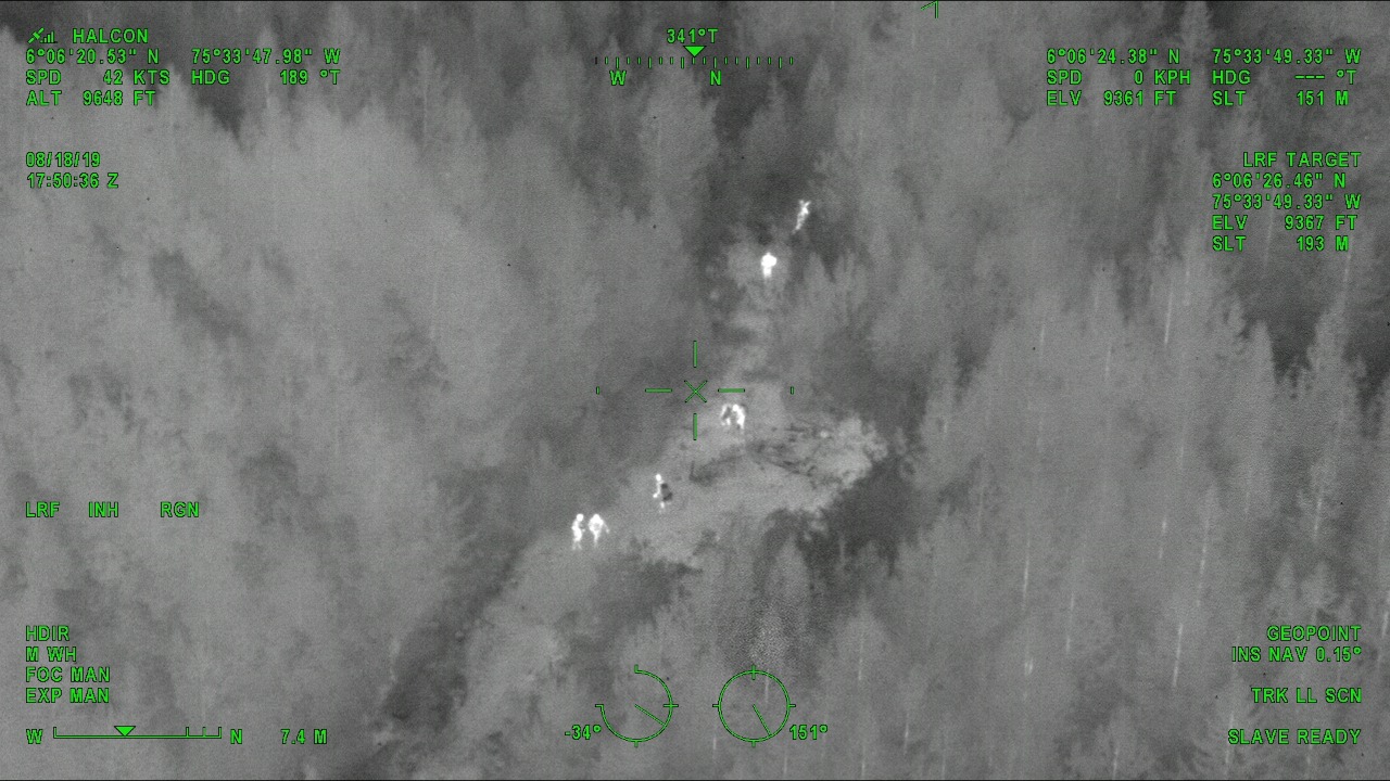 Tras dos horas y media de búsqueda por parte de la aeronave y con la ayuda de la cámara FLIR Filtro Electro Óptico, sensor de calor, fueron ubicados en una zona boscosa y fueron guiados hasta una vía donde existe acceso vehicular.