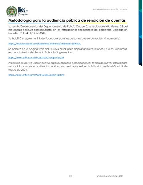 En concordancia con el artículo 78 de la Ley 1474 de 2011, como parte del ejercicio de transparencia en la administración pública, el Departamento de Policía Caquetá realizará audiencia pública de rendición de cuentas el día 22/03/2024 a partir de las 9:00 am, en las instalaciones del auditorio del Comando de Policía Caquetá, ubicado en la calle 10 A # 11-40 barrio Juan XXIII del municipio de Florencia, donde socializará los resultados de la gestión que permitieron el cumplimiento de la misión durante la vigencia 2023.