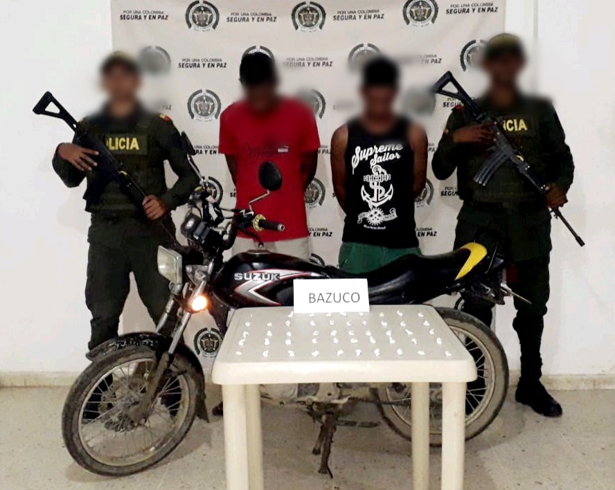 En el desarrollo de la estrategia institucional, encaminada a combatir el tráfico local de estupefacientes, en las últimas horas la Policía Nacional en el municipio de Regidor, al sur del Departamento de Bolívar, logró la captura de dos sujetos de 19 y 20 años de edad, quienes se movilizaban en una motocicleta, donde tenían escondidas cincuenta dosis de bazuco empacadas y listas para ser distribuidas en el municipio.