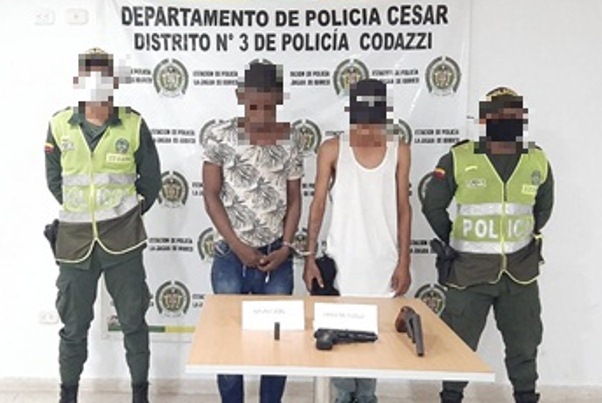 En esta acción son capturados dos ciudadanos de nacionalidad venezolana, a quienes se les incauta un arma de fuego calibre 16 MM, tipo artesanal, 02 cartuchos para la misma. Los capturados fueron dejados a disposición de la Fiscalía 32 Local de la Jagua de Ibirico, por el delito de porte, tráfico y/o fabricación de armas de fuego y municiones.