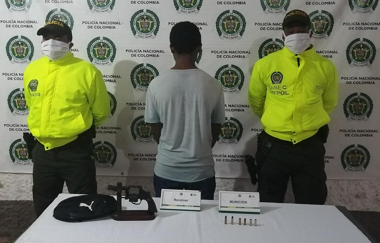 Uniformados de la Unidad Nacional de Intervención Policial y Antiterrorismo (UNIPOL) en coordinación de Inteligencia y del Modelo Nacional de Vigilancia Comunitaria por Cuadrantes adscritos al Departamento de Policía Antioquia, logran la captura de esta persona, conocido como ´Arias´ a quien se le incauta 01 arma de fuego tipo revolver calibre 38 con 06 cartuchos para el mismo de los cuales 04 cartuchos ya estaban percutidos.