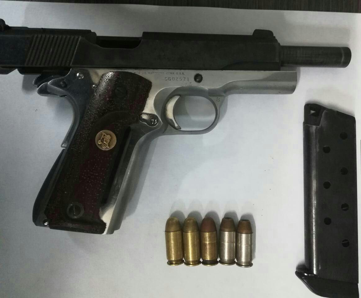 Mediante los planes operativos, disuasivos y preventivos desplegados por el Departamento de Policía Guajira, en las últimas horas dan con la captura de una persona de 22 años de edad, a quien se le hallo en su poder una pistola calibre 45 marca Colt, con un proveedor y cinco cartuchos para la misma.