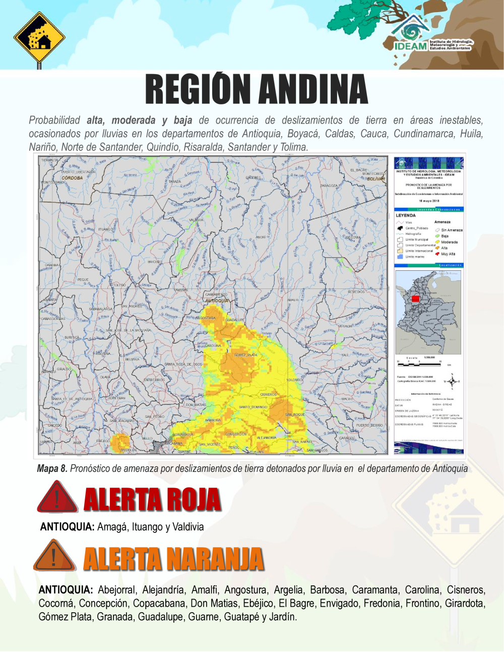 Probabilidad alta, moderada y baja de ocurrencia de deslizamientos de tierra en áreas inestables ocasionados por lluvias en los departamentos de Antioquia, Boyacá, Caldas, Cauca, Cundinamarca, Huila, Nariño, Norte de Santander, Quindío Risaralda, Santander y Tolima.