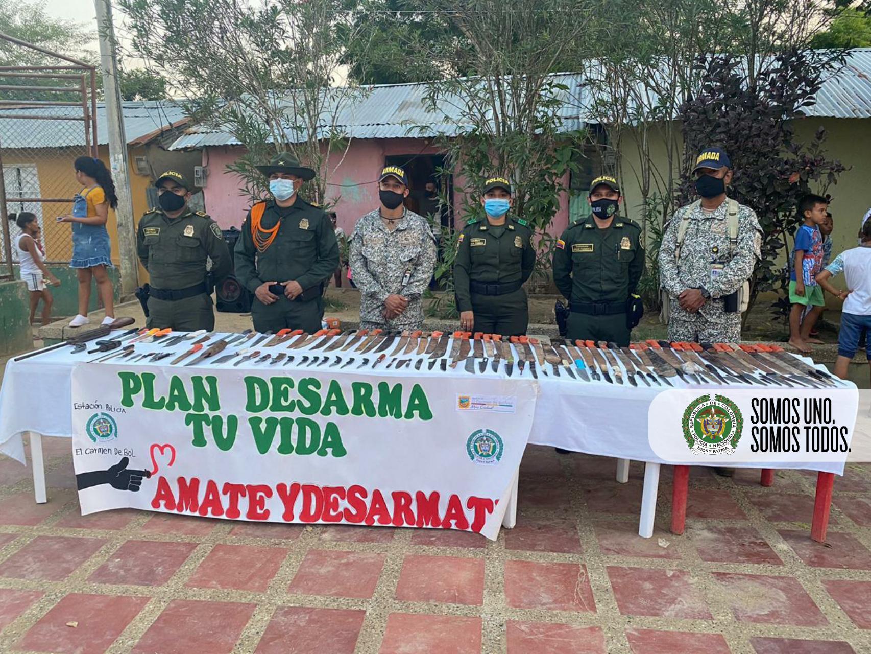 "Seguimos desarrollando el Plan Desarme por La Vida en el Carmen de Bolívar, con el que estamos enviando un mensaje de tolerancia e invitando a la comunidad a participar activamente en la construcción de paz. Queremos cambiar todo elemento cortante o que represente algún tipo de riesgo a la vida e integridad de las personas por alimentos que servirán como bienestar en los diferentes hogares, y recordando a la ciudadanía que, es mejor amarse que armarse", expresó el coronel Rivera Suescun.