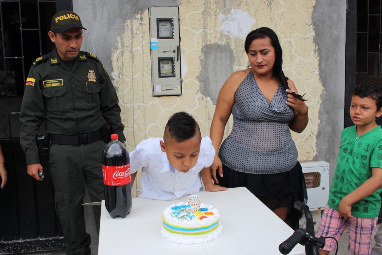 Este niño nunca se imaginó que los policías que todos los días ve en las calles de su barrio, ahora serían quienes le dieran esa gran sorpresa, y es que a ritmo de papayera, payasos y la móvil de la Radio Policía Nacional 100.0 Fm Ibagué, habían llegado hasta su casa, no solo con shows artísticos, sino con una torta de cumpleaños, gaseosa y el regalo que como el mismo manifestó “nunca lo imaginé”.
