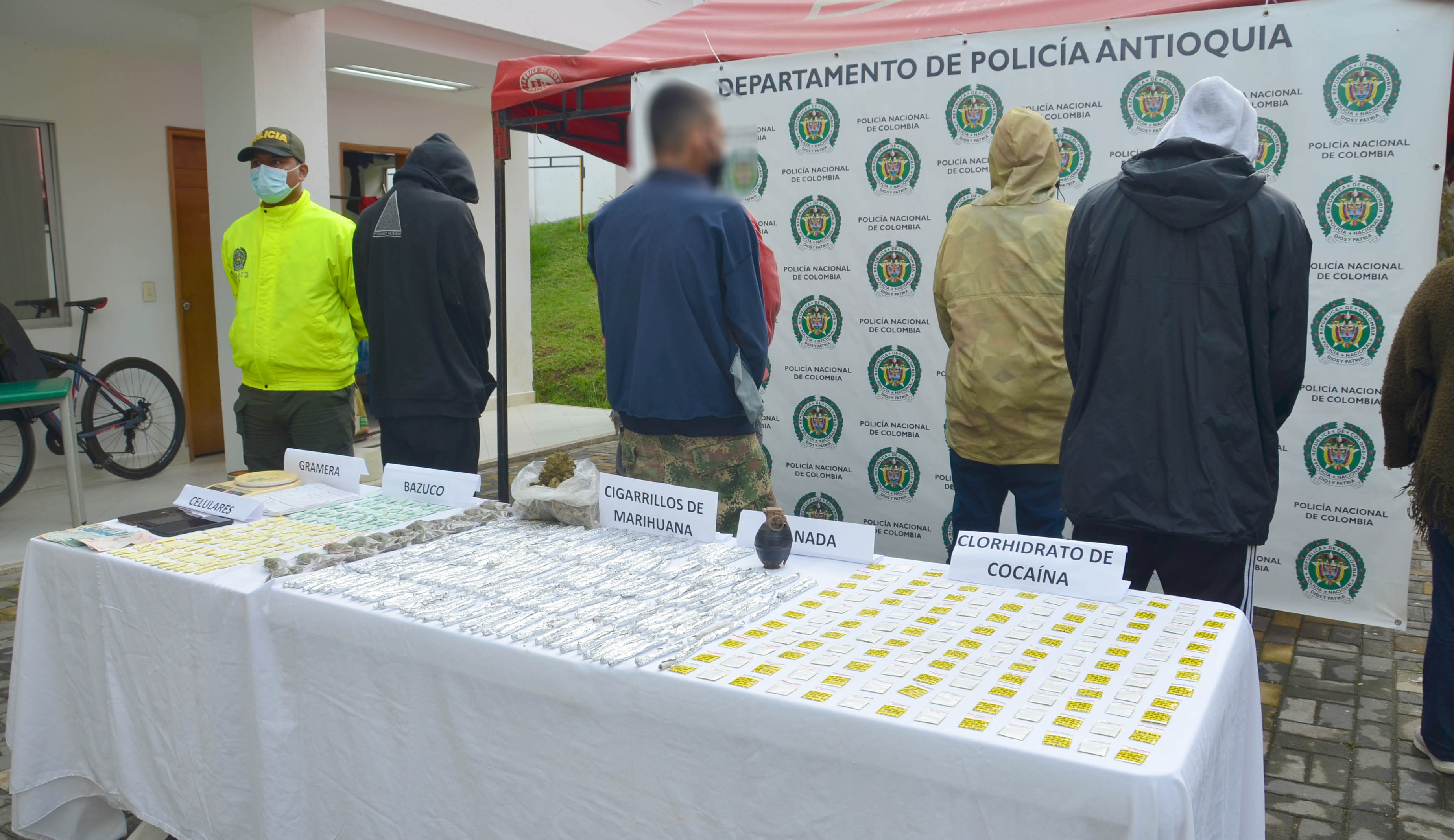 De esta manera se logró la incautación una granada de fragmentación, 50 bolsas herméticas con marihuana, 300 cigarrillos armados con marihuana, 700 gramos de marihuana, 200 dosis de perico, una gramera y dos celulares.