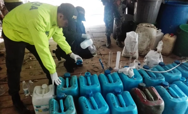 Es así como en las últimas horas, integrantes del Ejército y la Policía llegan a un punto de la vereda, donde fue destruido un laboratorio para el procesamiento de clorhidrato de cocaína, en donde fueron incautados 338 gramos de coca, igualmente se destruyeron insumos líquidos y sólidos, relacionados así: dos construcciones artesanales en madera y plásticos, tres hornos microondas, cinco mesas de madera, una prensa hidráulica, 1000 unidades de papel filtro, dos cuartos de secado, un extractor de aire, dos probetas de 500, dos vasos dosificadores uno de 600 ml y otro de 400 ml, un gusano acerado de 6 huecos, un escurridero de madera y malla plástica de 5 cavidades, una pipeta de calentamiento de agua, un destilador en material de acero, 20 kilos de soda cáustica, 1334 gramos de carbón activado, 12 canecas de acetona de 5 galones cada una, total avaluó de elementos destruidos $52.900.000.