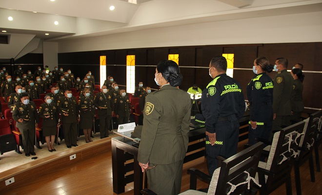 Dentro de las actividades protocolarias se invitó al personal de Mandos Ejecutivos al auditorio SI. Díaz Medina donde se hace invocación del himno nacional de la república de Colombia, minuto de silencio en honor a nuestros héroes fallecidos en cumplimiento del deber, presentación del video histórico institucional, palabras a cargo del señor Comisario José Antonio Londoño Lozano, Mando Ejecutivo de Comando Dirección General y las palabras a cargo de la señora Coronel Doris Edith Manosalva Pinto Directora Escuela.