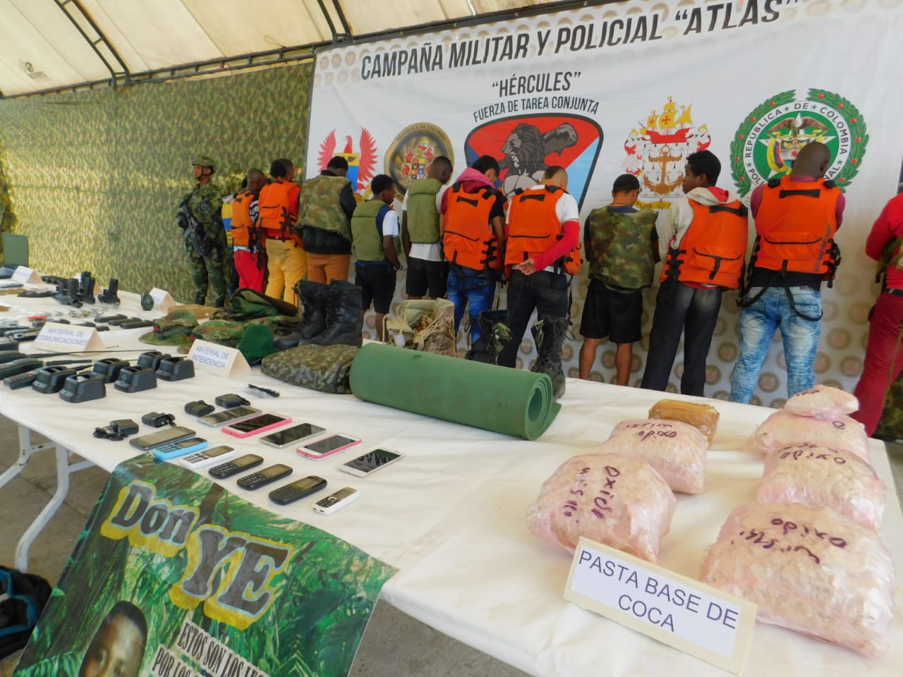 Hasta ese lugar llegaron los integrantes de la Fuerza Pública por vía terrestre y fluvial y adelantaron las operaciones simultáneas que permitieron, además de las 13 capturas, la incautación de cinco armas de fuego, entre ellas una pistola Five-seven, proveedores, munición de distintos calibres, 200 metros de cordón detonante, 30 detonadores, una granada de fragmentación, ocho radios de comunicación, aproximadamente siete kilos de base de cocaína, computadores, celulares y material de intendencia.