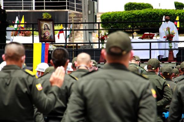 En un acto simbólico la comunidad académica representada por profesionales de policías, docentes policiales y estudiantes, celebramos la eucaristía el día del Sagrado Corazón que nos recuerda el núcleo central de nuestra fe. Convencidos del precepto Dios y Patria elevamos una plegaria por nuestros compañeros que ofrendan sus vidas en el cumplimiento del deber y en el marco al valor del honor policial.