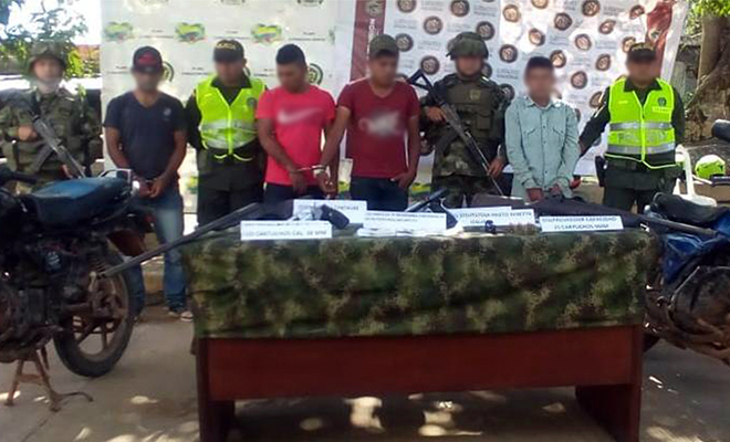 El operativo se registró en zona rural de la vereda Loma Linda del municipio de Puerto, cuando estos sujetos conocidos en el mundo del delito como ‘Biron’, ‘el mecánico’, ‘veneco’ y ‘Javi’, fueron interceptados por los uniformados momentos después de arrojar un costal a un costado de la vía e intentar huir en dos motocicletas de color azul y negro.