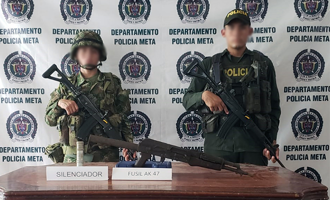 Por último, en la vereda Angosturas del municipio de Lejanías, nuestras unidades de la Vigilancia con apoyo de tropas del Ejército, le quitaron un fusil marca AK-47 a los grupos armados organizados que delinquen en la zona, el cual fue encontrado dentro de una lona hallada a un costado de la vía, en donde habría sido abandonada por sujetos que huyeron al percatarse de la presencia policial. Siendo dejado a disposición de la Fiscalía 20 seccional de Granada.