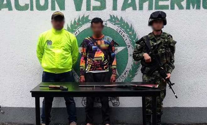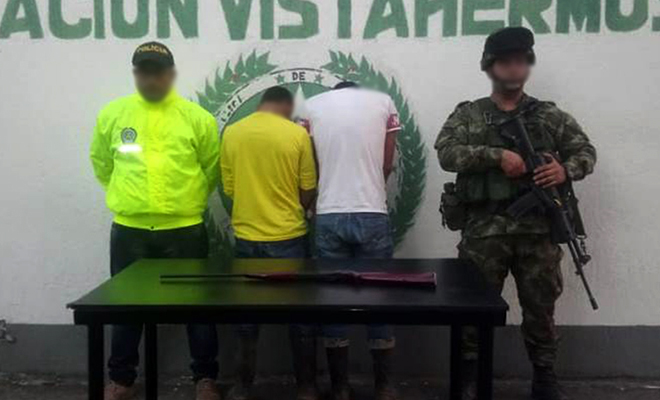 Ambos casos se registraron en horas de la mañana, el primero, se dio sobre la vía que conduce del casco urbano hacia la inspección Piñalito, en donde luego de arduas labores de vigilancia fueron capturados dos hombres de 30 y 27 años de edad, a quienes se les halló en su poder una escopeta de fabricación artesanal, sin permiso para porte o tenencia.