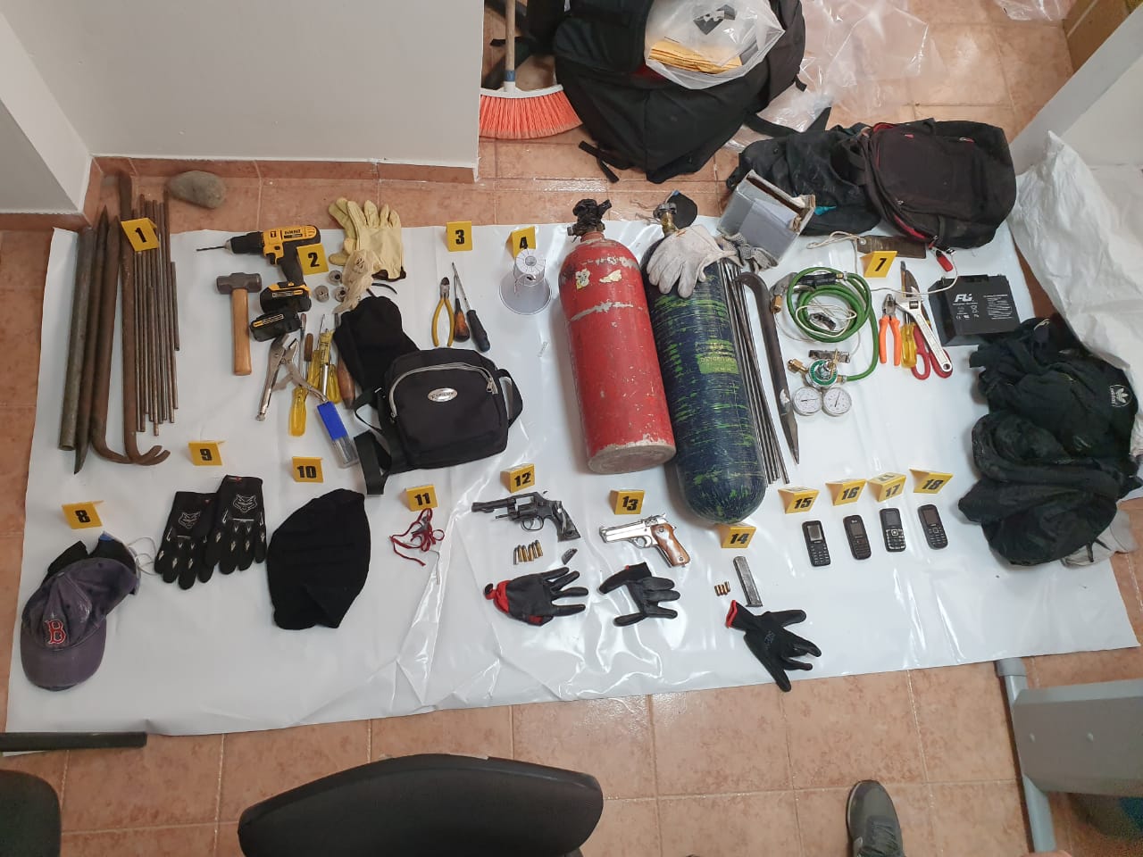 En este procedimiento fueron capturadas 06 personas, de igual manera se incautaron dos armas de fuego sin permiso, una de ellas tipo revolver calibre 38 largo y la otra una pistola calibre 7.65 mm; al igual que herramientas de construcción como palancas aceradas, macetas, barrillas, taladros eléctricos, destornilladores, pinzas, guantes y 02 tanques de oxicorte, elementos con los que pretendían romper la caja fuerte de la entidad.