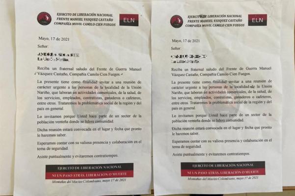 Con el fin de prevenir la comisión de delitos en los municipios del departamento, personal del Modelo Nacional de Vigilancia Comunitaria por Cuadrantes (MNVCC), en el barrio La inmaculada del municipio de La Unión - Nariño, se logró la captura en flagrancia de dos personas, quienes fueron sorprendidos por uniformados portando panfletos intimidatorios alusivos al Frente de Guerra Manuel Vásquez Castaño.