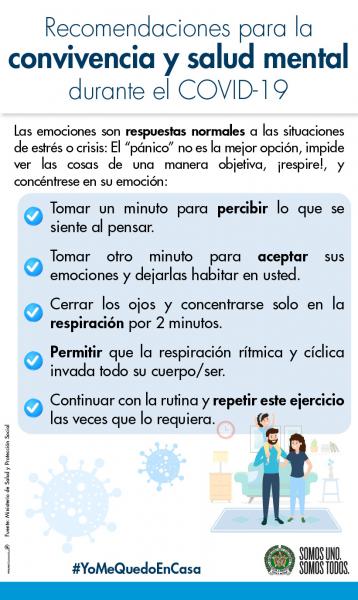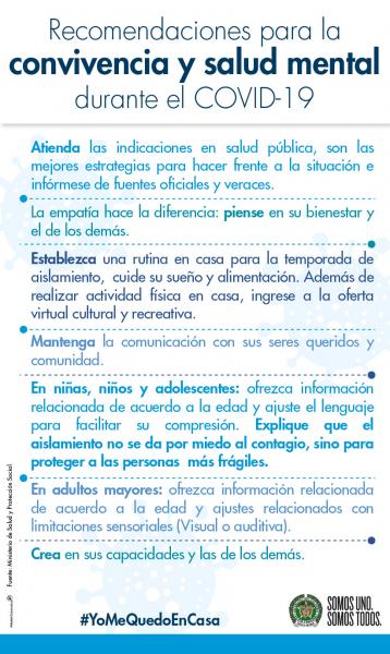 Para ello el Ministerio de Salud y Protección Social ha generado unas recomendaciones que ayudan a proteger la salud mental de niños y adultos en el contexto que estamos viviendo de aislamiento social y la Dirección de Sanidad les exhorta a seguirlas para lograr una mejor convivencia, donde el aislamiento sirva como pretexto para mejorar las relaciones y disfrutar los espacios y momentos compartidos.