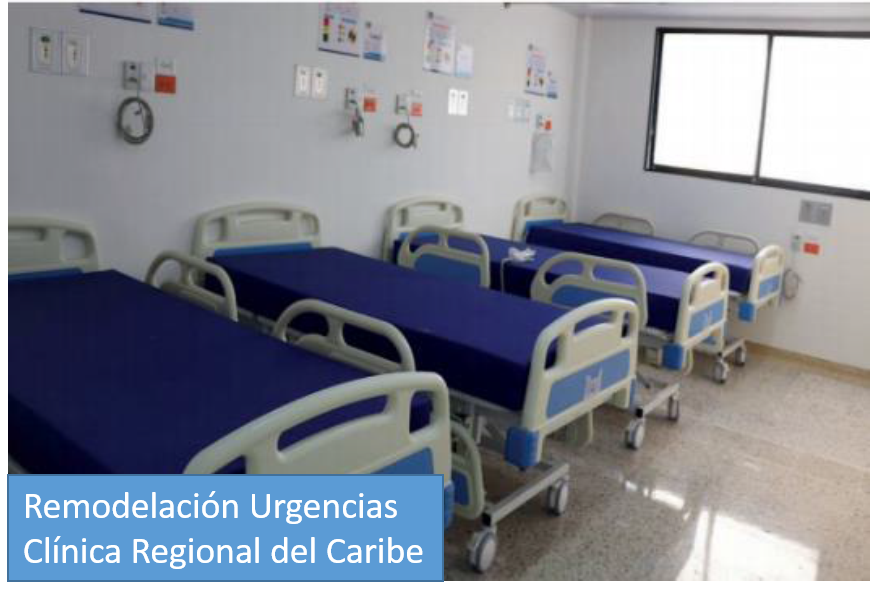 - Clínica Regional del Caribe (Barranquilla): Remodelación del servicio de urgencias, adaptado especialmente para atender la emergencia sanitaria con 6 camas en Unidad de Cuidados Intensivos, 10 camas para pacientes con oxígeno y 14 cubículos para pacientes ambulatorios con menor complicación.