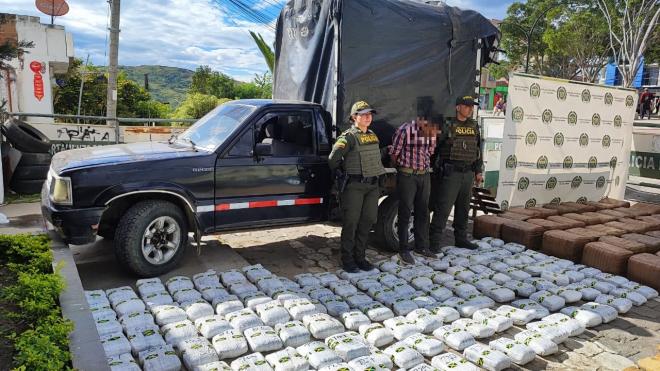 Oportunos controles policiales desplegados por uniformados adscritos al Modelo Nacional de Vigilancia Comunitaria por Cuadrantes (MNVCC), con el apoyo de la seccional de Inteligencia Policial (SIPOL), permitieron en las últimas horas asestar un contundente resultado en materia operativa con la captura en flagrancia de un ciudadano por el delito de tráfico, fabricación o porte de estupefacientes y la incautación de más de una tonelada de marihuana.
