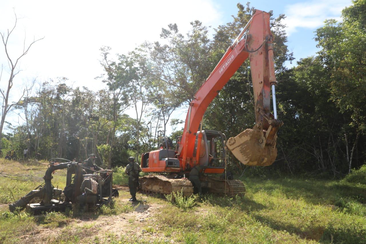La Policía Nacional en el marco del plan de choque “el que la hace la paga”, en coordinación con el tropas del Ejército y la Fuerza Aérea, logró desmantelar un centro de explotación ilícita de yacimiento minero donde fueron capturadas tres personas y destruidas dos máquinas retroexcavadoras y un motor.