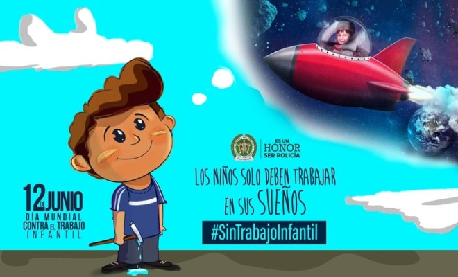 En el marco del Día Mundial contra el Trabajo Infantil y en cumplimiento a la Estrategia de Convivencia y Seguridad Ciudadana de la Policía Nacional, el grupo de Protección a la Infancia y Adolescencia, Prevención y educación ciudadana, personal de los cuadrantes del departamento de Policía Tolima, a esta hora vienen desarrollando una campaña denominada los niños solo deben trabajar en sus sueños #SinTrabajoInfantil #ColombiaUnaRazón, con la que se busca proteger los derechos y garantizar la integridad de niños, niñas y adolescentes en los 42 municipios que conforman la jurisdicción de la Policía Tolima, donde se les recordó a la comunidad que el grupo de infancia y adolescencia cuenta con tres líneas de acción las cuales son prevención, vigilancia y control e investigación criminal.
