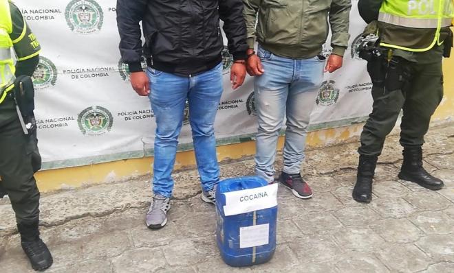 En el tramo vial Pasto – Higuerones, sector La Macarena del municipio de Buesaco, uniformados detuvieron y registraron un vehículo en el cual se movilizaban dos sujetos, que transportaban una caneca y en su interior encontraron un líquido aceitoso al cual se le realizó la Prueba de Identificación Homologada (PIPH), resultando ser clorhidrato de cocaína, esta sustancia fue avaluada en 37 millones de pesos.
