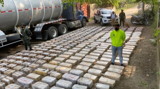 Durante el fin de semana la Dirección de Antinarcóticos también incautó en otro vehículo tipo grúa, 411 kilos de clorhidrato de cocaína, luego que los uniformados efectuaran un puesto de control en una vía rural en el municipio de Tambo (Cauca), y se percataran que en un compartimento del automotor se encontraban 414 paquetes rectangulares con el alcaloide.