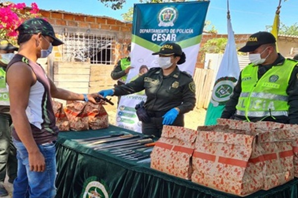 La actividad contó con el apoyo de la empresa privada y la participación de los líderes comunitarios del barrio Altos de Pimienta, donde inicialmente se realiza una charla de sensibilización sobre el respeto entre vecinos, la sana convivencia y el uso de los elementos de bioseguridad, posteriormente se inicia la entrega de mercados por intercambio de armas cortopunzantes.
