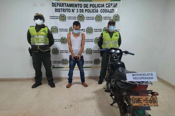 En el desarrollo de los planes focalizados para neutralizar todo tipo de delito en el Departamento del Cesar, personal de la Estación de Policía de La Jagua de Ibirico en actividades de control y contención del delito de hurto y delitos conexos lograron la captura en flagrancia de un sujeto que habían hurtado una motocicleta.