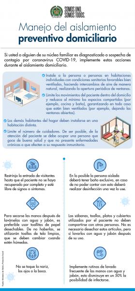 El Ministerio de Salud y Protección Social indica las siguientes acciones y cuidados que se deben implementar en el aislamiento preventivo domiciliario para disminuir el riesgo de transmisión del virus.