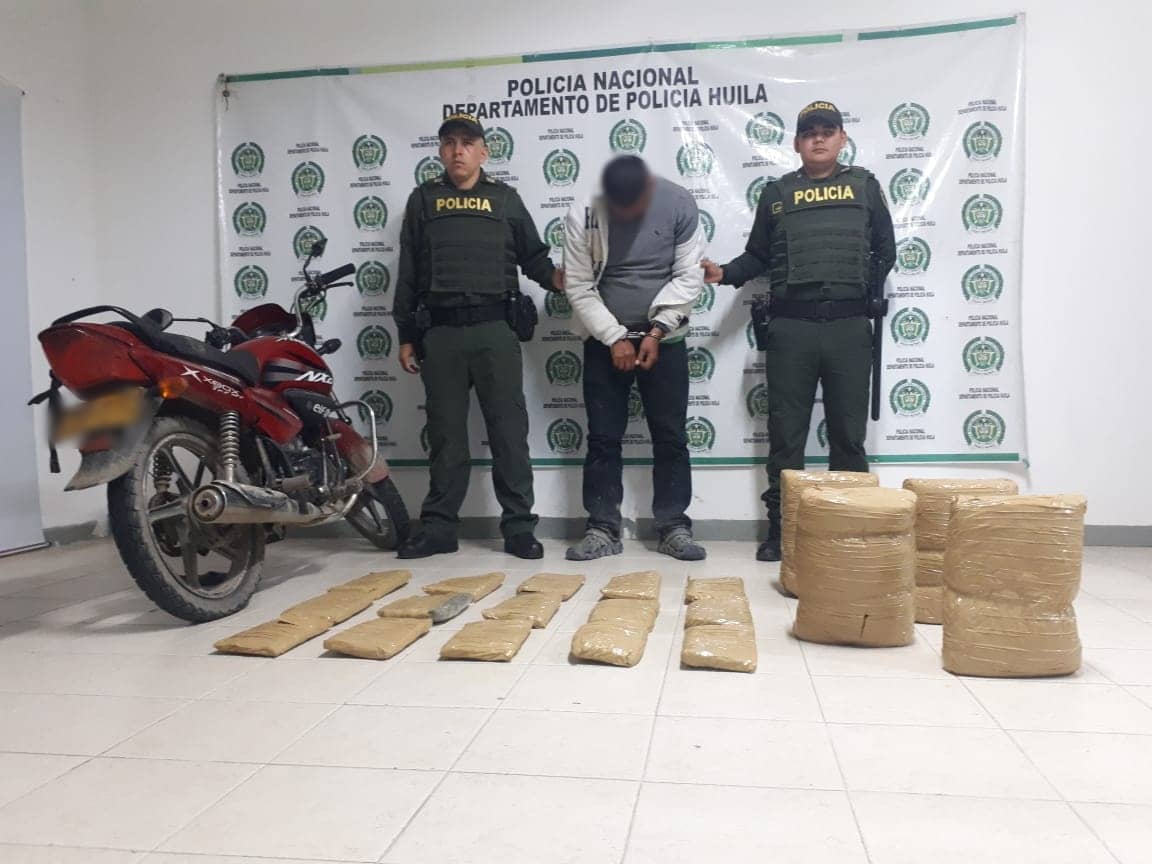En un punto de información y control del grupo de Antinarcóticos instalado en la vereda Panorama kilómetro 3 vía Inzá, se logró la captura de un sujeto que se movilizaba en motocicleta y en una maleta de viaje le fueron hallados 2 kilos de marihuana y 20 de gramos de base de coca.
