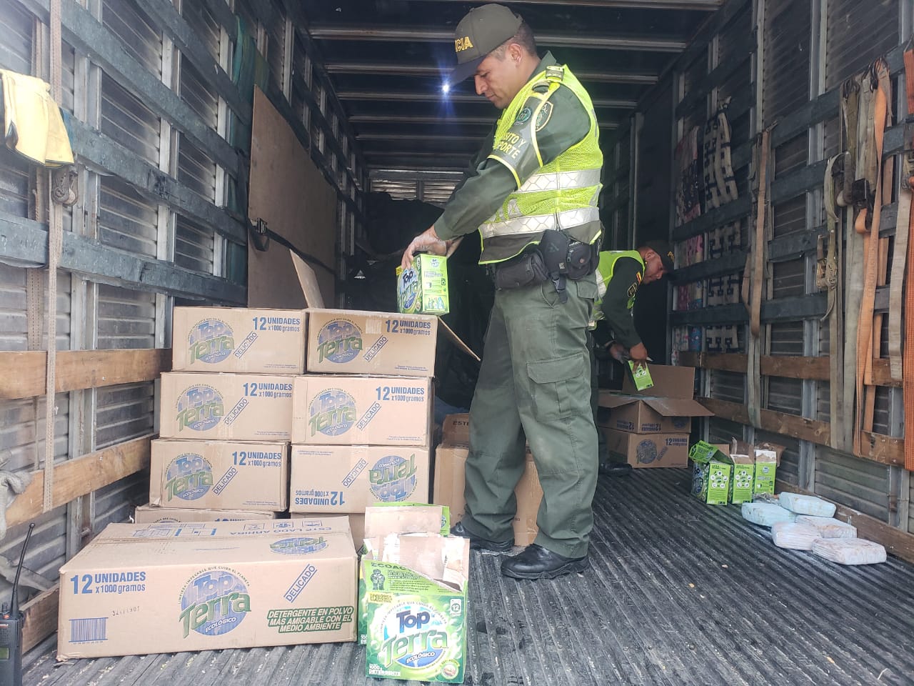 Los uniformados procedieron a efectuar el registro de rutina, abriendo la parte posterior del camión, y entre las encomiendas que transportaba la persona capturada, ubicaron 10 cajas de cartón que a simple vista pareciera ser jabón en polvo de la marca Top Terra.