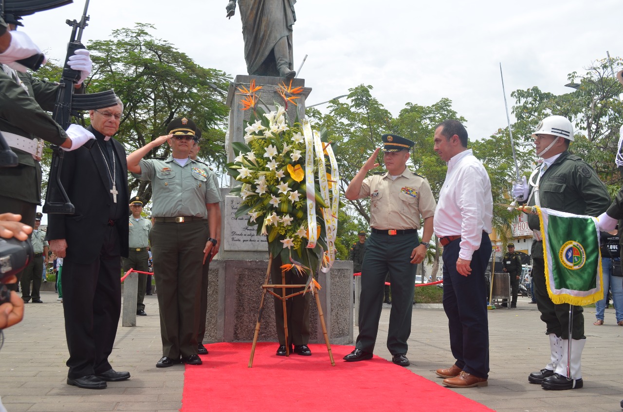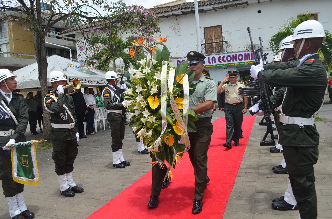 Posteriormente en un acto solemne se realizó la colocación de una ofrenda floral en el monumento Simón Bolívar de la plaza central del municipio, en compañía de las autoridades asistentes se otorgó un minuto de silencio con el que se les rindió un homenaje a los Policías y Militares víctimas del conflicto armado en nuestro país.