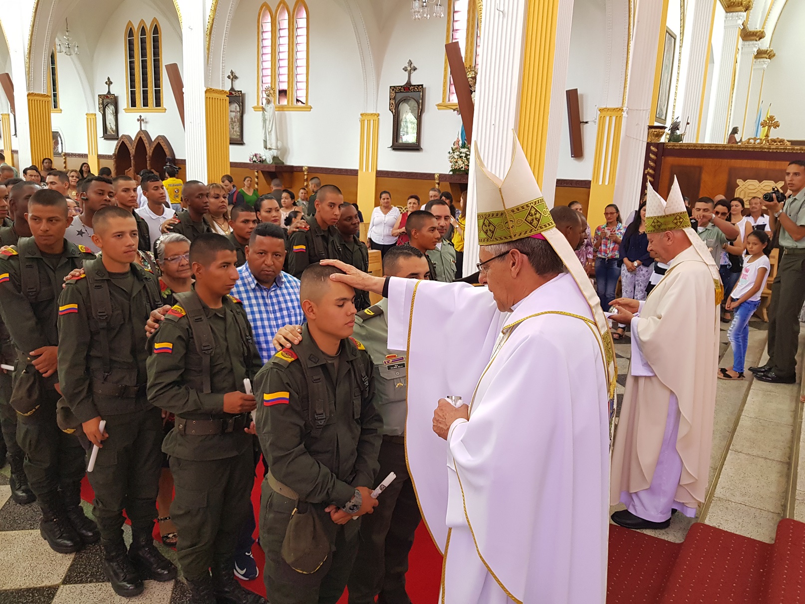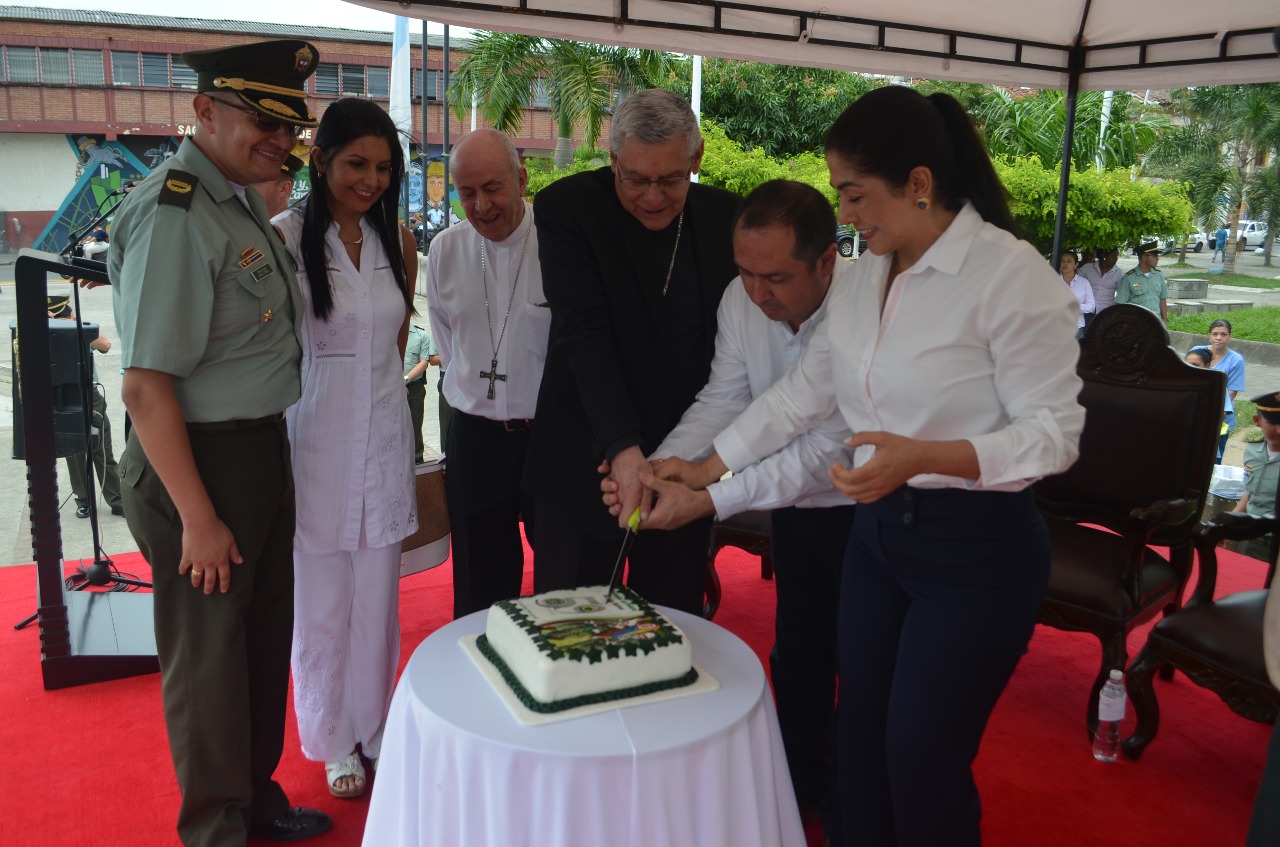 La eucaristía estuvo presidida por Monseñor Fabio Suescun Mutis, obispo castrense, acompañado del arzobispo de la diócesis de Buga José Roberto Ospina León Gómez; de igual manera asistieron a la ceremonia el señor director de Escuela Andrés Alejandro Torres Sánchez, el Ingeniero Gustavo Vélez Román, alcalde de este municipio, en donde se elevó un mensaje al altísimo sobre solidaridad y compañerismo, complementando la liturgia con la confirmación de 54 Auxiliares de Policía quienes se encuentran en periodo de formación en la escuela.
