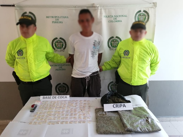 La actividad operacional se desarrolló en la calle 3 con carrera 10 barrio Alfonso López de La Virginia Risaralda, donde unidades de la Seccional de Investigación Criminal lograron la captura de una persona de 30 años, natural de La Virginia, hallándose en su poder 1500 gramos de marihuana y 100 gramos de base de coca.
