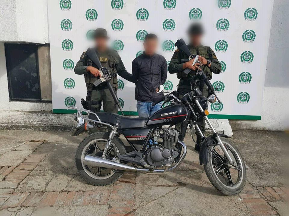 En otro sector del municipio, en operativos de registro y control desarrolladas por uniformados, se realiza la detención a un motorizado, continuando con el procedimiento, se le pide los documentos de la motocicleta Auteco pulsar modelo 2016, color roja, al realizarle la investigación de antecedentes del automotor, el sistema policial arroja que se encuentra requerida por el delito de Hurto, los uniformados materializan la captura de una persona, de 23 años de edad, oriundo de convención de Norte de Santander por el delito de Receptación.