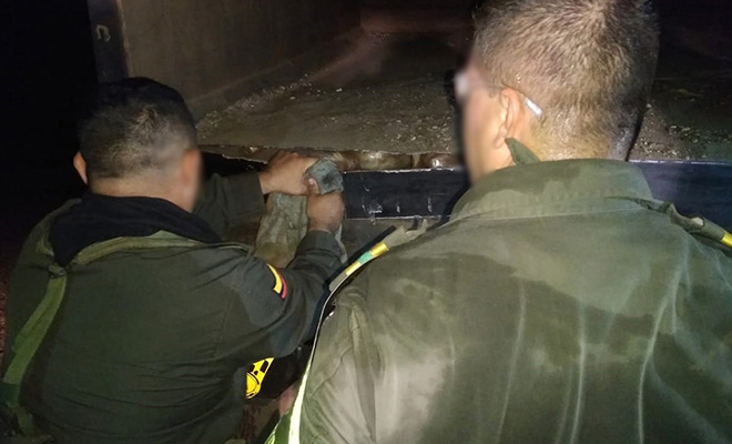 El operativo registrado sobre el kilómetro 110, en la vía que de la vereda Rubiales conduce hacia el municipio de Puerto Gaitán, dejó la captura de dos hombres de edades 30 y 42 años de edad, luego de que la perspicacia y experiencia de los uniformados, les permitirá hallar e incautar 216 kilogramos de base de cocaína y sus derivados, en una caleta doble piso del volcó de la volqueta en que se movilizaban estos sujetos.