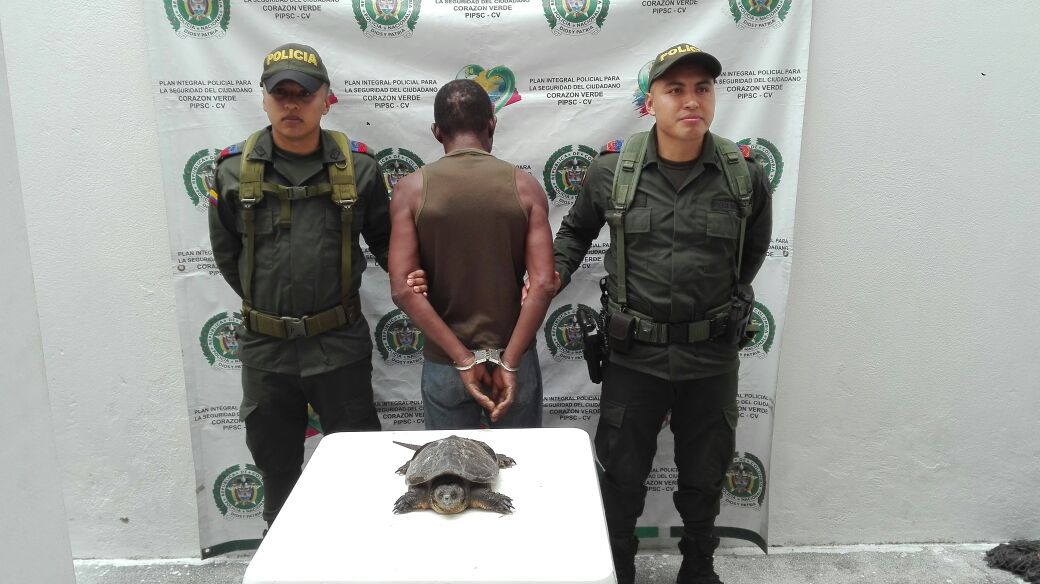 Comprometidos con el cuidado de nuestro medio ambiente, para promover el desarrollo ecológico de nuestro país y contribuyendo con conservación de las diferentes especies, Personal Policial adscrito a la Estación de Policía de Mallama, mediante labores de control en el barrio centro del municipio, lograron la captura en flagrancia de un hombre que fue sorprendido llevando en su poder una tortuga, especie Icotea, nombre científico (Trachemys callirostris), con valor ecológico avaluado en $5´164.019 sin ningún tipo de documentación legal o permiso que acredite la propiedad, tenencia y/o comercialización de recursos fáunicos protegidos, la espécimen fue hallada en unas condiciones deplorables dentro de un recipiente en la bodega de un bus de servicio público de la línea Supertaxis que cubría la ruta Tumaco- Pasto.